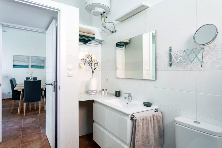 | Beide Badezimmer verfügen über geräumige, ebenerdige Duschbereiche, große Waschtische mit Stauraum, beleuchtete großflächige Spiegel, Ablageflächen sowie WC. | ||