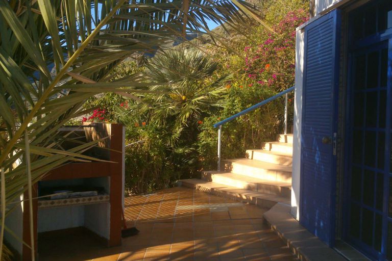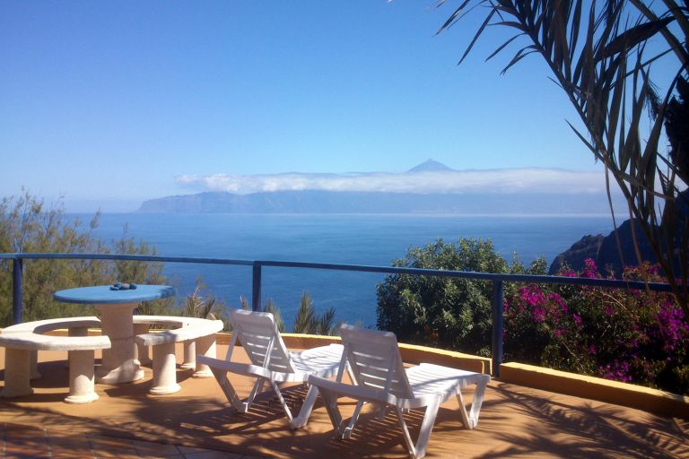 | Eine ca. 60 qm große Terrasse, von der Sie das Tal von Hermigua, das Meer und den Teide von Teneriffa sehen können, umschließt die Ferienwohnung. Sonnenliegen, diverse Sitzmöglichkeiten und ein Gartengrill stehen für Sie bereit. Eine Palme spendet auch an heißen Tagen ausreichend Schatten, und dazu weht meist ein kleines Lüftchen, das Erfrischung spendet. Die Playa de la Calete, einen wunderschöner Naturbadestrand, erreichen Sie über einen Wanderweg oder mit dem Auto von Hermigua aus. Dort kann man nicht nur Baden, sondern auch Essen und Getränke bekommen. | ||