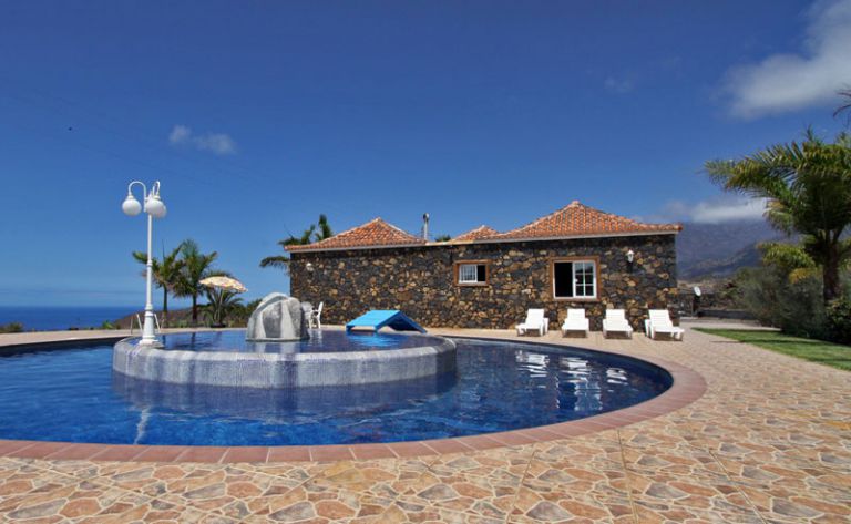 | Großes, alleinstehendes Ferienhaus mit Pool auf La Palma. Dieses alleinstehende, gut ausgestattete mit Natursteinen verkleidete Ferienhaus im kanarischen Stil liegt zentral und dennoch ruhig, mit freiem Blick auf den Atlantik und die Berge, ca. 360 Meter über dem Meer. Das Ferienhaus ist von einem Gartengelände mit einem großen Swimmingpool umgeben. |