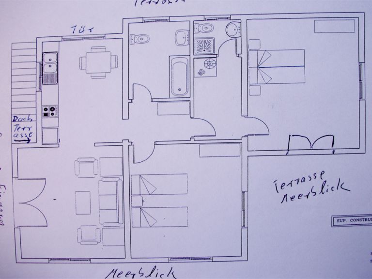 | Das 100 qm große Ferienhaus ist für 4 bis 5 Personen geeignet. Es steht Ihnen ein gemütlich eingerichteter Wohnraum mit Couchecke und SAT -TV, CD-Player, Schlafcouch und einer halbintegrierten Einbauküche mit Eßplatz zur Verfügung sowie zwei Schlafzimmer mit jeweils einem Doppelbett und zwei Bäder mit Dusche bzw. Badewanne, Waschbecken, WC und Waschmaschine. | |||||