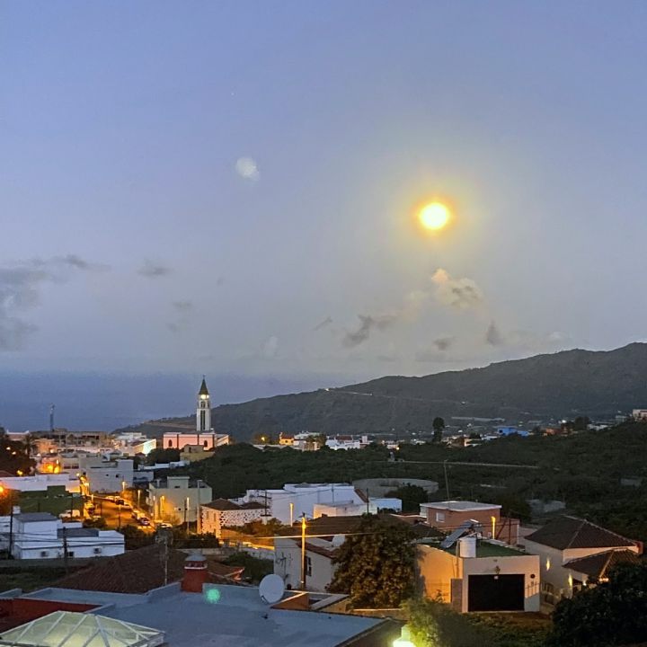 | Der 65 qm große, ganzjährig nutzbare Pool kann von den Bewohnern zwei weiterer Appartements, die sich in einem anderen Haus auf dem weitläufigen Fincagrundstück befinden, genutzt werden. Da das Ferienhaus in Nordsüd Lage ausgerichtet ist, bietet es einen guten Schutz vor Ostwinden. So können Sie auch bei dieser Wetterlage windgeschützt vor dem Haus, auf der Balkon oder der Terrasse sitzen. Foto links: Ausblick von der Terrasse auf den Monduntergang. |