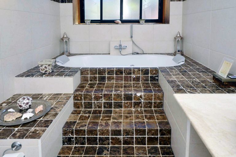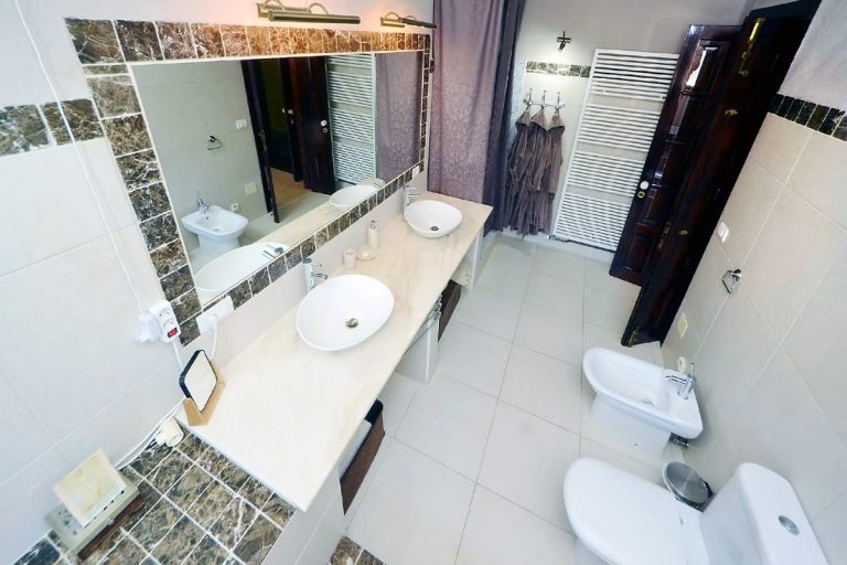 | Das geräumige Bad ist mit zwei großen Waschbecken ausgestattet, einer Dusche in Marmor, einer Whirlpoolbadewanne, WC und Bidet, sowie einer Sprossenheizung und einer elektrischen Fußbodenheizung. | |||||
