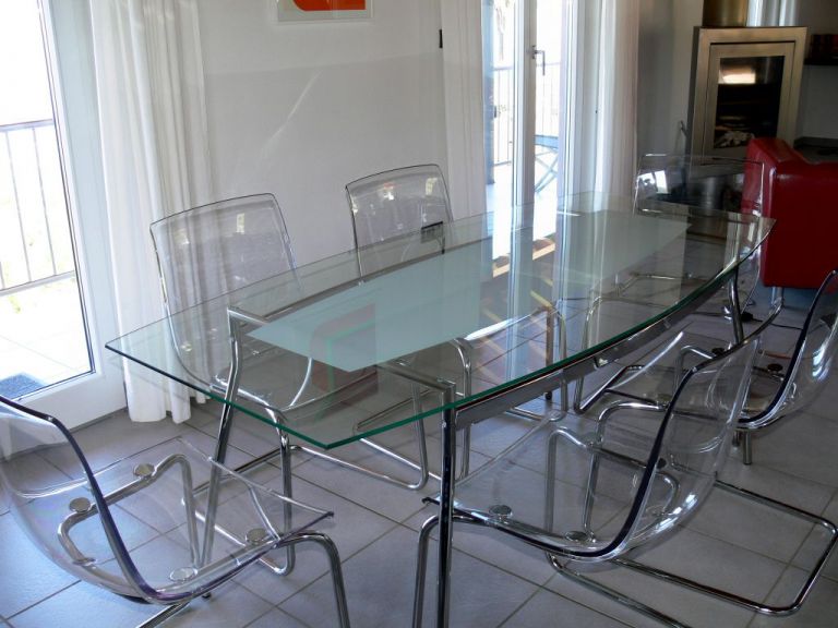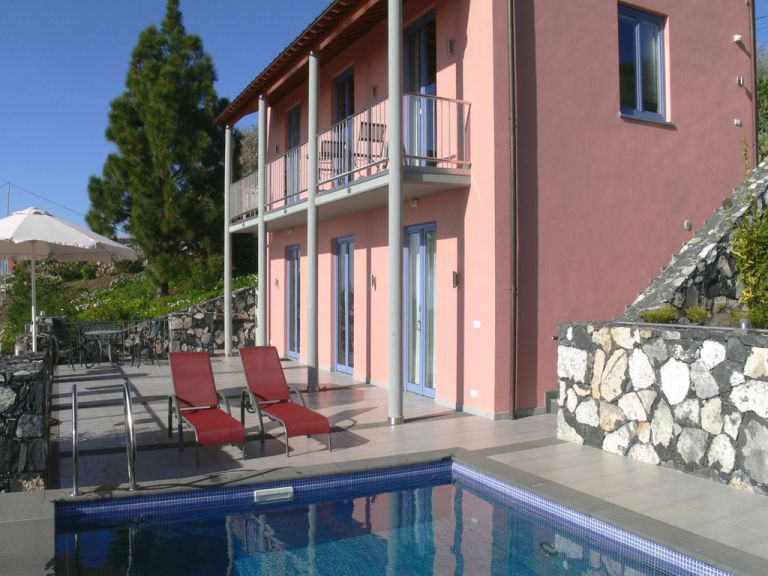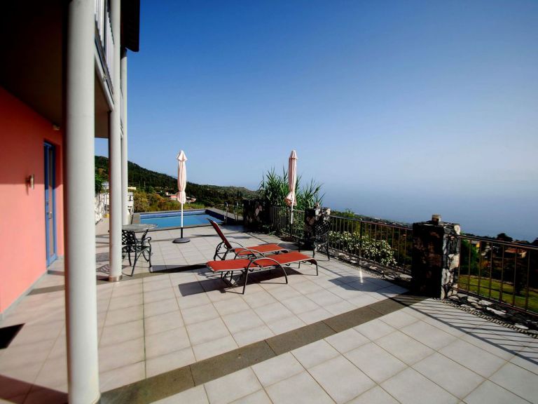 | Das Ferienhaus ist von einem großzügigen Außenbereich mit einem beheizten Pool umgeben. Dazu zählt eine große Terrasse, eine zusätzliche Frühstücksterrasse, ein Balkon vor dem Wohnbereich, ein gepflegter subtropischer Blumengarten, ein Steingarten und naturbelassenes Gelände. | |||||