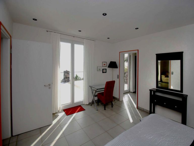 | Das geräumige Schlafzimmer, mit direktem Zugang zur großzügigen Terrasse am Pool, verfügt über ein Doppelbett (2 x 100 x 200) und einen Schreibtisch. | |||||