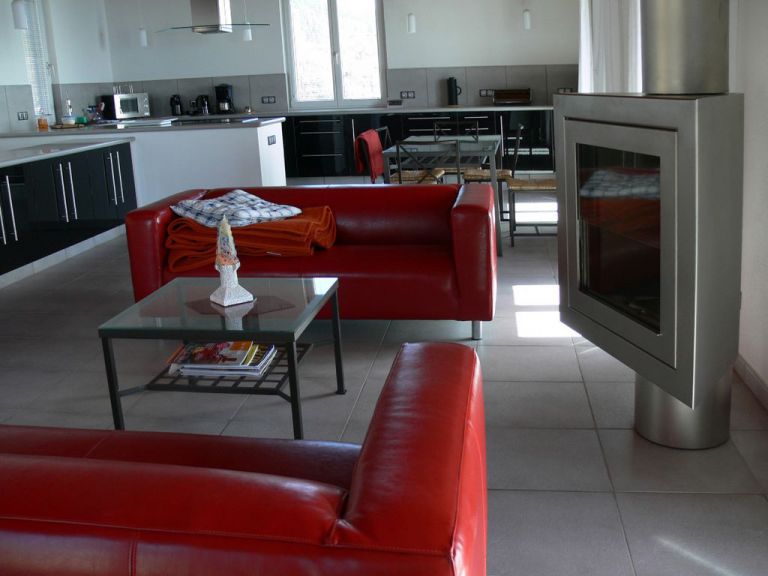 | Das Ferienhaus verfügt über einen Wohnbereich mit einem drehbaren Designer - Kamin, einer Ledersitzgarnitur, die auch als Schlafcouch für eine dritte Person dienen kann, SAT - TV, DVD - und CD - Player, Internetzugang (WLAN), Radio und einer kleinen Bibliothek. | |||||