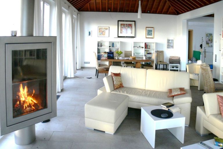 | Das ca. 70 qm große Wohnzimmer mit integriertem Eßbereich ist mit Ledersitzmöbeln, einem drehbaren Designer - Kamin, einer kleinen Bibliothek mit Büchern, CDs und DVDs, SAT - TV, Radio, CD - Player und DVD - Player und Internetzugang (WLAN) ausgestattet. | ||