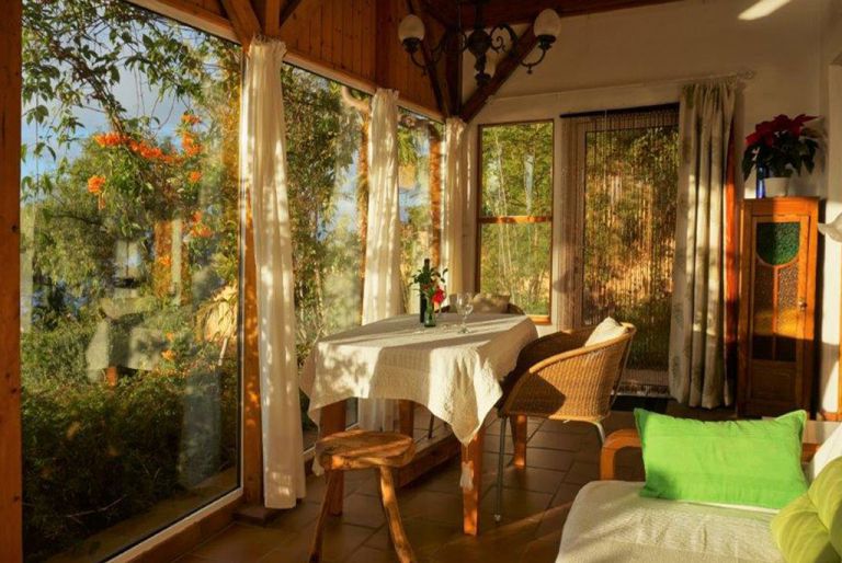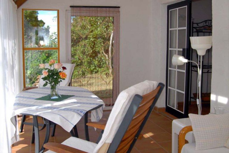 | Wunderbar ist der herrliche Wintergarten mit einer Couch und einem Esstisch. Von hier aus erreichen Sie die Wohnküche mit einem Zweiplatten Elektroherd, Backofen, Kühlschrank, Waffeleisengrill, Kaffeemaschine und einem Eßtisch. Ein tragbarer CD-Player ist vorhanden. | ||