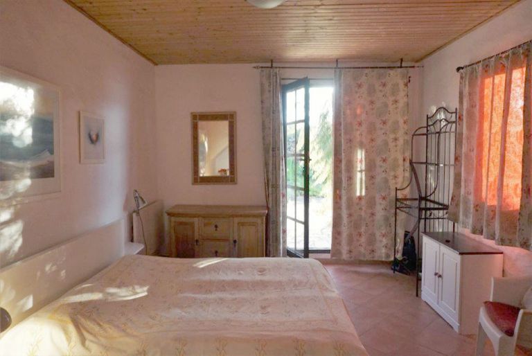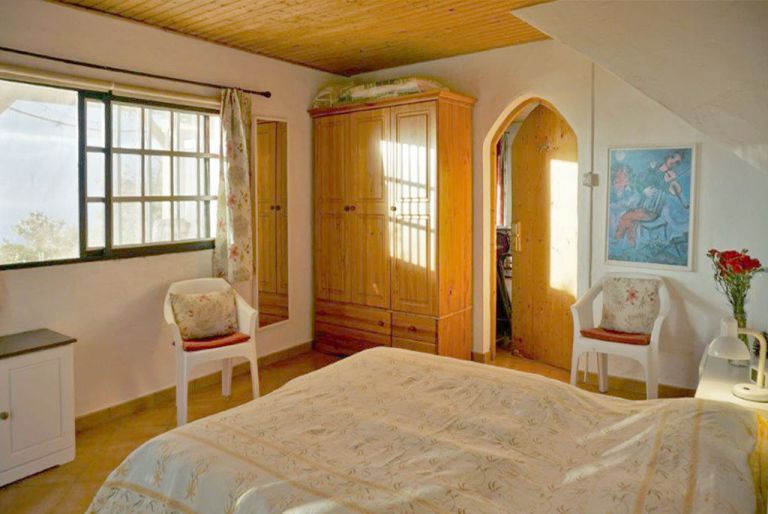 | Das Schlafzimmer mit angrenzendem Duschbad ist mit einem Doppelbett (160 x 200) ausgestattet und führt direkt auf die große, geflieste Terrasse, die Richtung Westen und Meer liegt. | ||