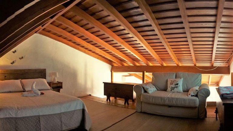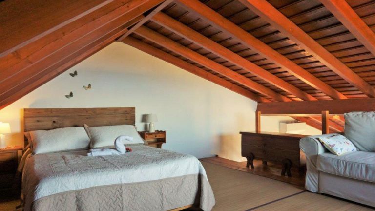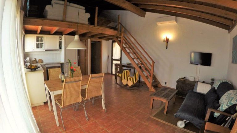 | Über eine Holztreppe erreichen Sie den oberen, offenen Schlafraum mit einem Doppelbett (140 x 190), der sich unter dem rustikalen Holzdach befindet. Das Fenster gibt den weiten Blick auf's Meer frei. Es steht ein kleiner Schrank zur Verfügung und ein sehr gemütliches Sofa. | |||||