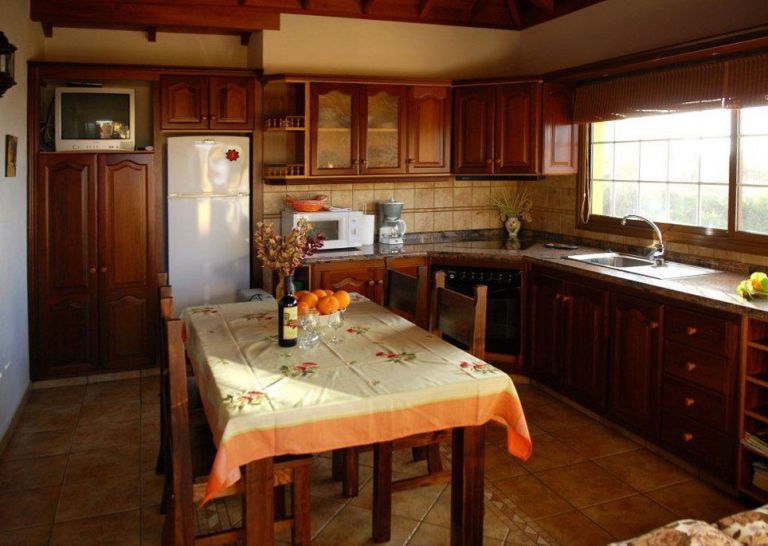 | Das Ferienhaus verfügt über eine große Wohnküche, die durch die grandiose Aussicht über den üppig grünen Barranco auf den Atlantik besticht. Die schöne Holzküche hat einen direkten Zugang zu der zum Teil überdachten Terrasse. Sie ist mit einer Granitarbeitsplatte und jeglichem Komfort ausgestattet und bietet Ihnen Elektroherd mit Cerankochfeld, Backofen, Mikrowelle, Bügelbrett, Bügeleisen und alles erforderliche Küchenzubehör. Weiterhin ist die Küche mit einem Esstisch, einem separten Frühstücksplatz, Sofa, SAT - TV und Musikrecorder möbliert. Für kühlere Abende stehen Ihnen zwei Heizkörper zur Verfügung. Die offene Holzbalkendecke verleiht dem Raum eine heimelige Atmosphäre. | ||