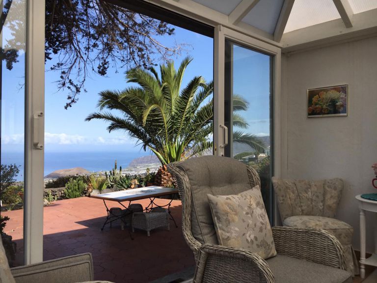 | Der Wintergarten mit einem Kacheltisch für sechs Personen ist vom Wohnzimmer und einem Schlafzimmer aus begehbar. Er hat volle Morgensonne, einen tollen Meerblick und wird gerne zum Frühstücken genutzt. | |||||