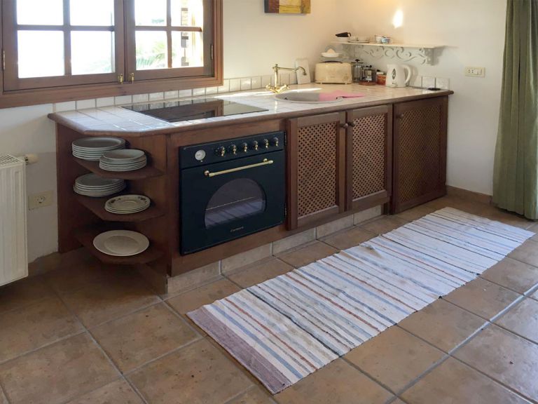 | Die mit einer Sitzbank und einem Holztisch gemütlich ausgestattete Einbauküche verfügt über einen Elektroherd mit Cerankochfeld, Backofen, Geschirrspüler, einen Kühlschrank, Kaffeemaschine, Toaster und Wasserkocher. | |||||