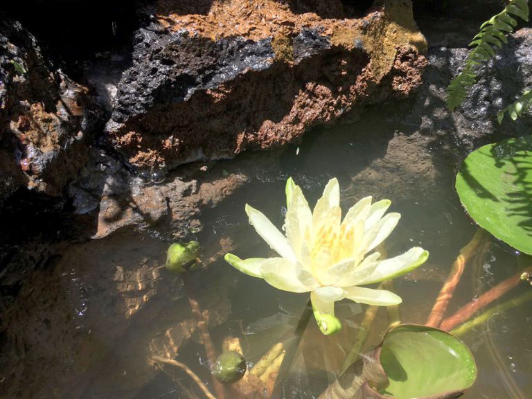 | Seerosenteich mit kleinem Springbrunnen und Sonnenliegen | |||||