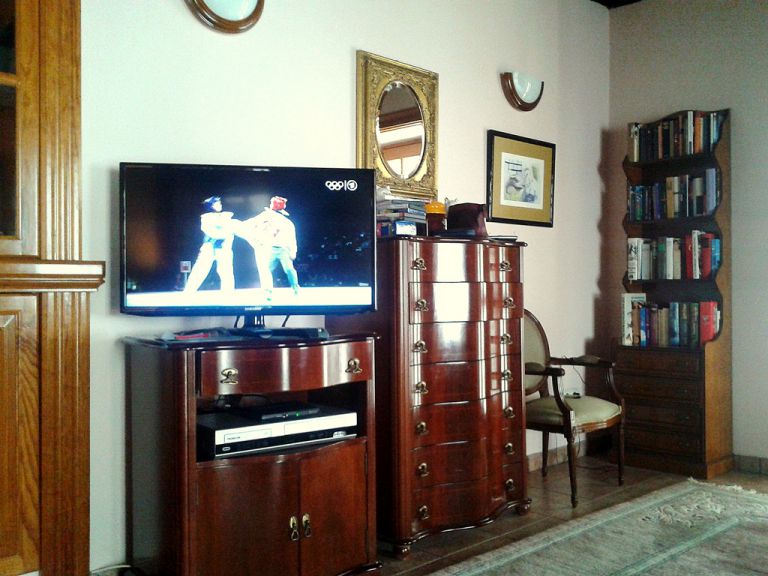 | Der Salon ist mit Ledersitzmöbeln, einem Kaminofen (Holz steht kostenlos zur Verfügung), einer kleinen Bibliothek, SAT-TV, Radio, CD-Player mit zahlreichen Klassik Musikangeboten, DVD bzw. VHS-Player, Telefon und Internetzugang (WLAN) ausgestattet. | |||||