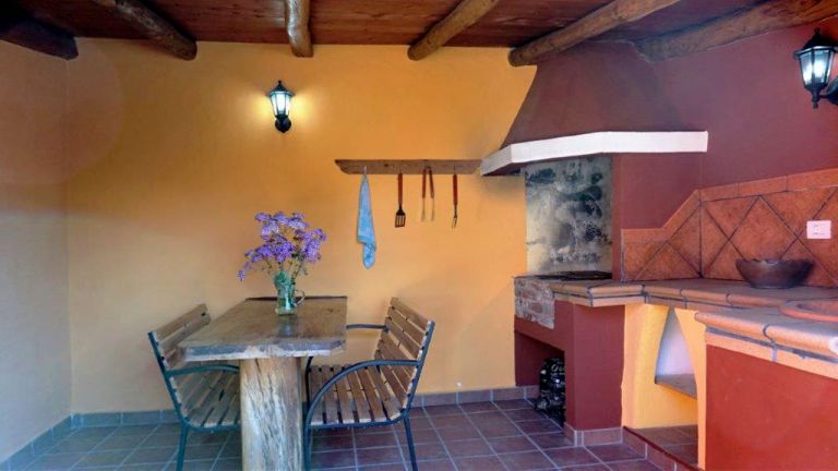 | Dahinter, ebenfalls direkt am Haus liegt eine weitere Terrasse mit einem kleinen Kräutergarten. Daneben befindet sich das urige überdachte Grillhaus mit Feuerstelle und Aussenküche. Auch hier gibt es einen Esstisch mit Bänken. Ein romantischer Ort, das Feuer hält warm und mit einem Glas Rotwein können Sie hier den herrlichen Sternenhimmel bewundern. | |||||