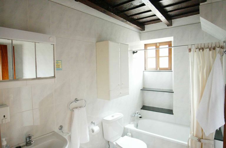 | Die rustikale Ausstattung mit Holzmöbeln steht in harmonischen Kontrast zu den hellen Wänden und der dunklen offenen Holzbalkendecke. Im gemütlichen Wohnbereich befindet sich ein großer offener Kamin. Darüber hinaus ist das Wohnzimmer mit SAT-TV und Stereoanlage ausgestattet. | ||