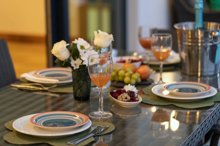 | Lassen Sie Ihren Urlaubstag am Abend auf der gemütlich und gut beleuchteten Aussenterrasse ausklingen oder genießen Sie hier Ihr Abendessen bei einem guten Glas Wein. Auch der beheizte Pool lässt sich beleuchten. |