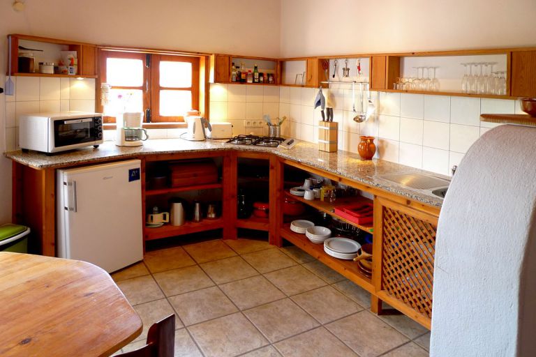 | Die aus Naturholz bestehende, mit Geschirr reichlich ausgestattete Küche mit einem vierflammigen Gasherd, ist separat angelegt. | ||