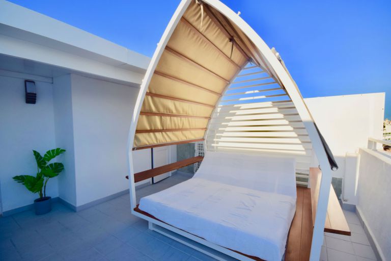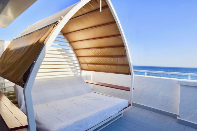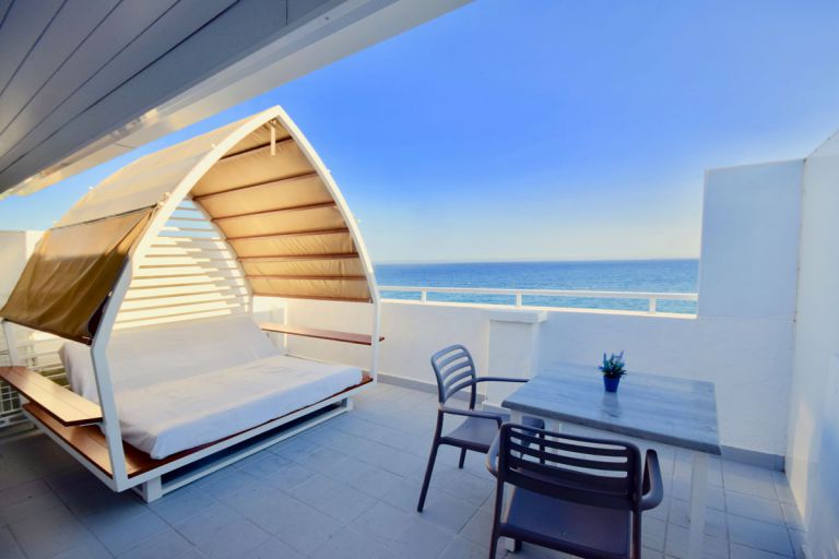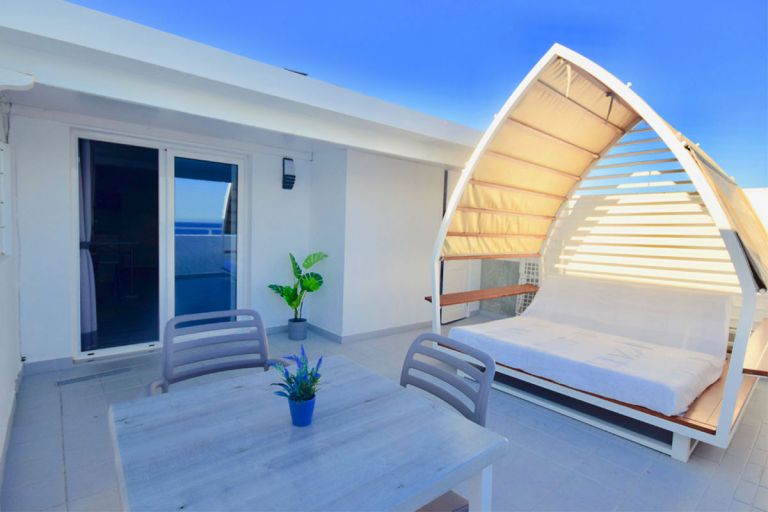 | Vom Wohnraum aus gelangen Sie auf die Terrasse mit Meerblick und Blick auf den Strand. Hier befinden sich eine überdachtes Doppelsonnenbett und ein Esstisch mit Stühlen. Sie benötigen keinen Mietwagen, da Sie nicht nur den Strand, sondern auch Restaurants und Bars bequem zu Fuß erreichen können. | |||||
