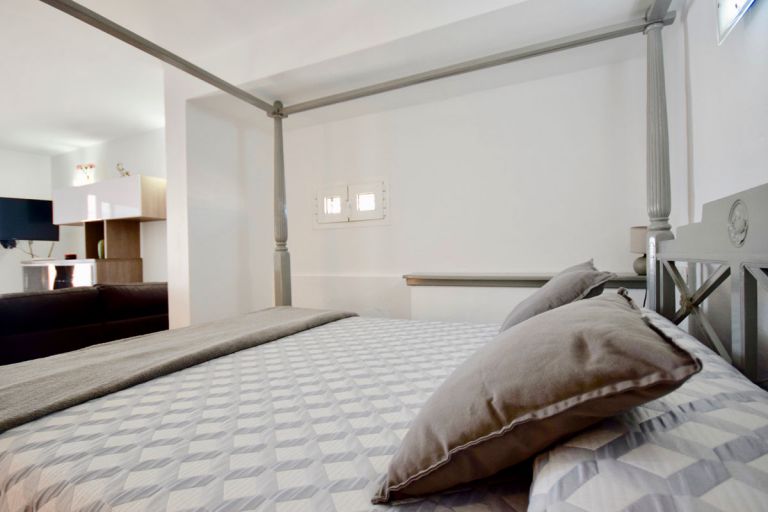 | Etwas separat, im hinteren Bereich des Raumes steht das große Kingsizebett mit zwei Nachtschränkchen. Das moderne Badezimmer verfügt über eine geräumige begehbare Dusche, einen Waschtisch mit Stauraum und WC. Ein Safe und ein Fön sind vorhanden. |