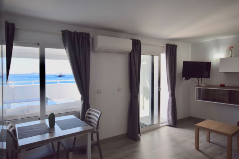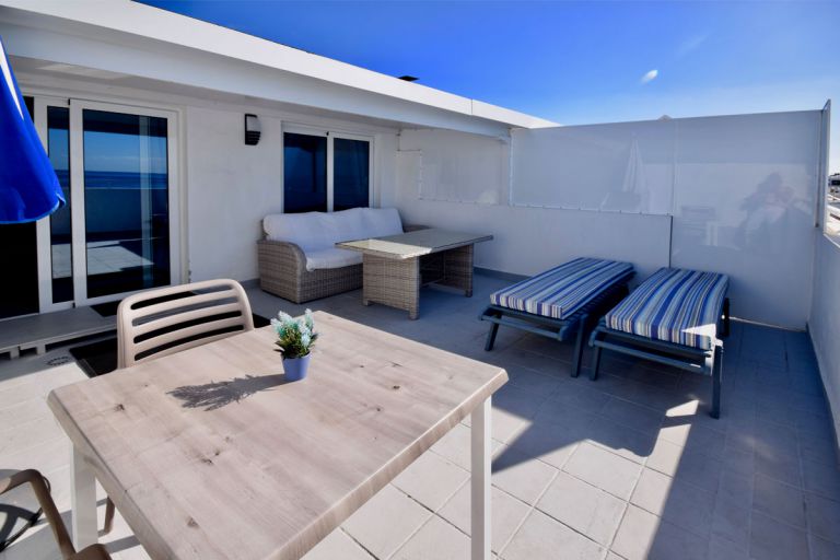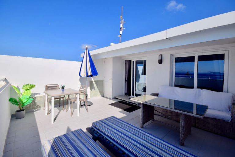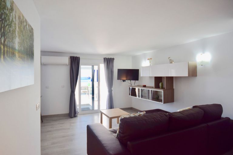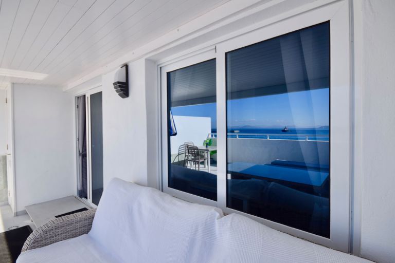 | Vom Wohnraum aus gelangen Sie auf die Terrasse mit Meerblick und Blick auf den Strand. Hier gibt es zwei Sonnenliegen mit Sonnenschirm, eine bequeme Rattancouch und ein Esstisch mit zwei Stühlen. Sie benötigen hier keinen Mietwagen, da Sie Restaurants und Bars bequem zu Fuß erreichen können und ebenso den Sandstrand, der sozusagen vor der Haustüre liegt. | |||||