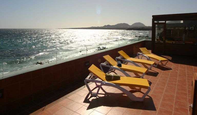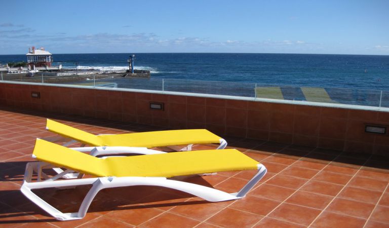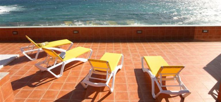 | Gehen Sie von der Wohnung aus ein paar Schritte nach oben über den verglasten Patio, so gelangen Sie auf die Sonnenterrasse auf dem Dach. Dort befinden sich Liegestühle, ein überdachter Sitzplatz und ein verglaster Pavillon. Das Meer liegt direkt davor. Allerdings müssen Sie die Dachterrasse mit den beiden kleinen Studios im Haus teilen, wobei diese wirklich groß genug dafür ist und einen tollen Rahmen für unvergessliche Abende direkt am Meer bietet. | |||||