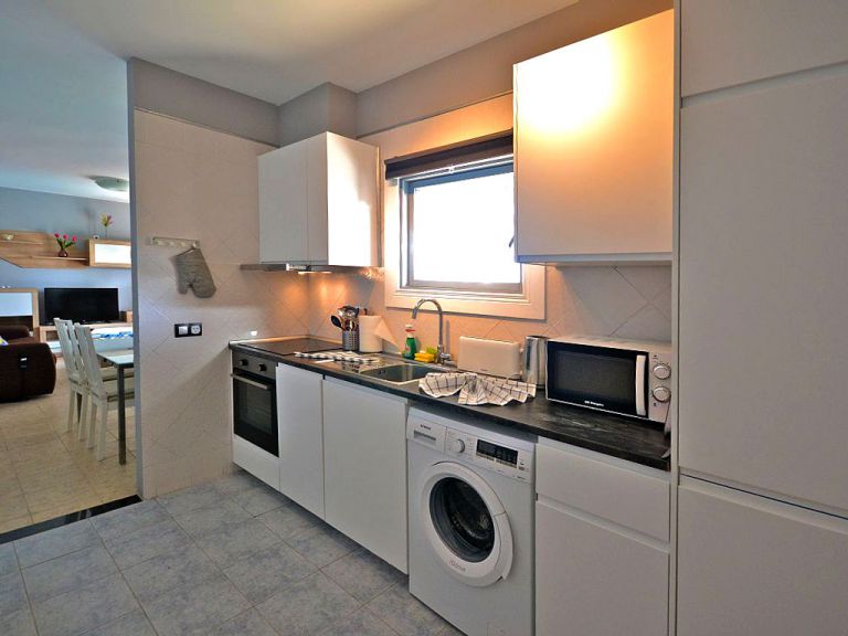 | Die etwas abgeteilte Küche ist mit Geschirrspüler, Cerankochfeld, Kühlschrank, Toaster, Wasserkocher und sonstigen Küchenutensilien ausgestattet. Eine Waschmaschine ist vorhanden. |