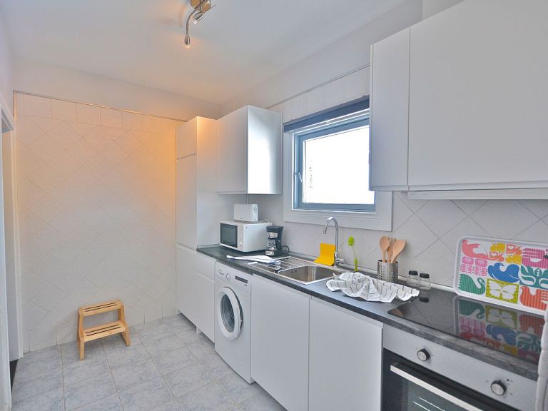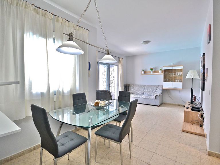 | Vom Wohnzimmer aus haben Sie einen direktem Zugang auf die Terrasse. Durch die große Fensterfront ist es sehr hell und freundlich. Es verfügt über eine Couch, SAT-TV mit Deutschen Programmen, einen DVD-PLayer und kostenlosem Internetzugang. Hier befindet sich auch der Esstisch für 4 Personen. Die teilweise abgeteilte Küche ist mit Geschirrspüler, Cerankochfeld, Kühlschrank, Toaster, Wasserkocher und zahlreichen Küchenutensilien ausgestattet. |