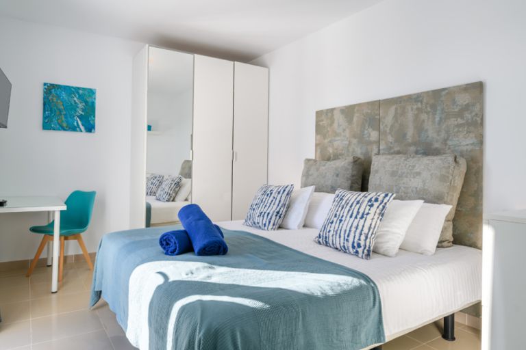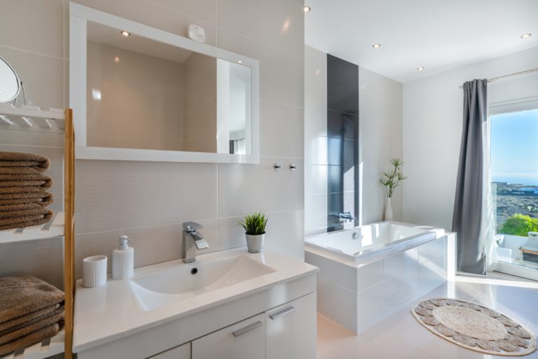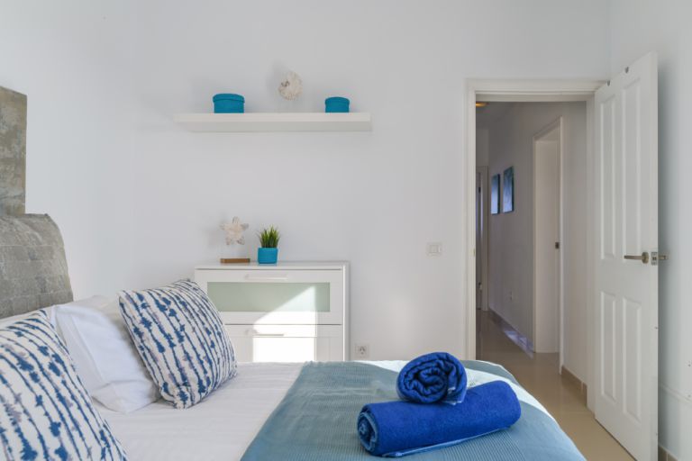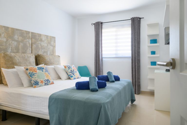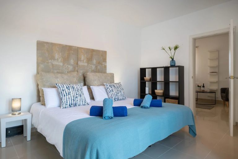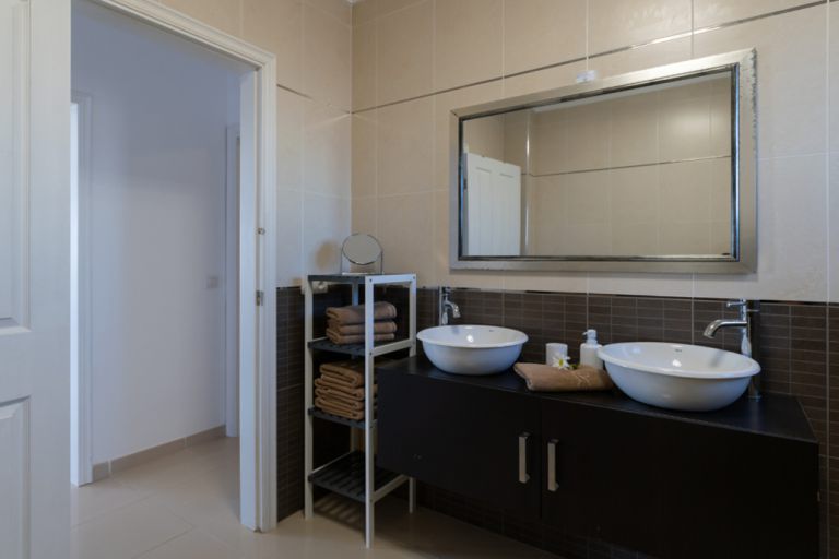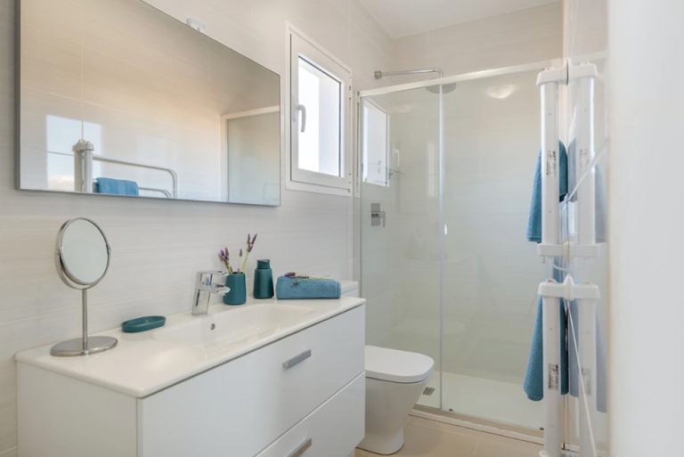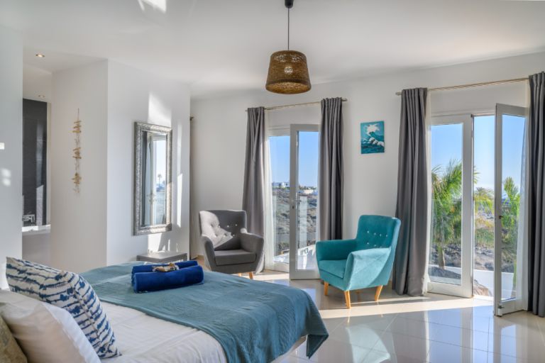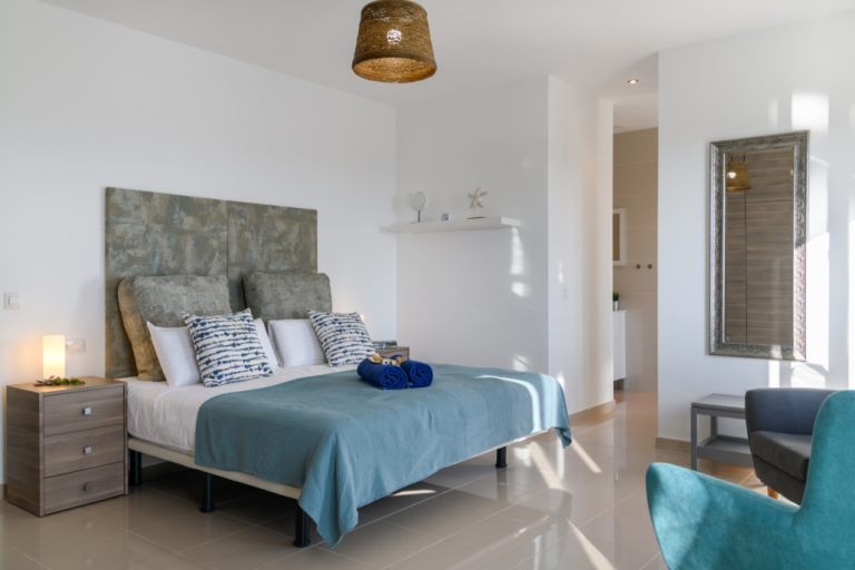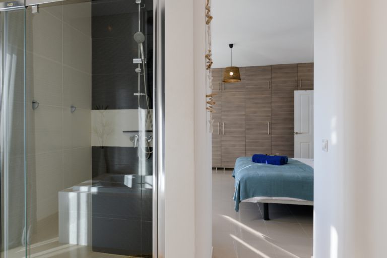 | In der oberen Etage liegen 3 Schlafzimmer mit Doppelbetten (180 x 200) und 2 Badezimmer. Das Master Schlafzimmer und ein weiteres verfügen über ensuite Badezimmer mit Dusche. Zwei Schlafzimmer bieten einen schönen Meerblick. Alle Schlafzimmer sind mit JBL Bluetooth Boxen ausgestattet. Die Villa wird über eine großzügige Solaranlage mit Energie versorgt. |