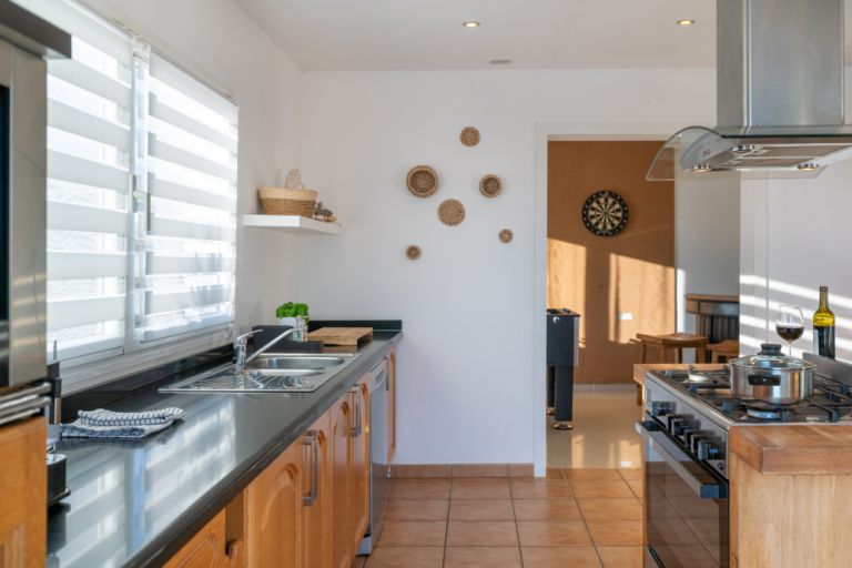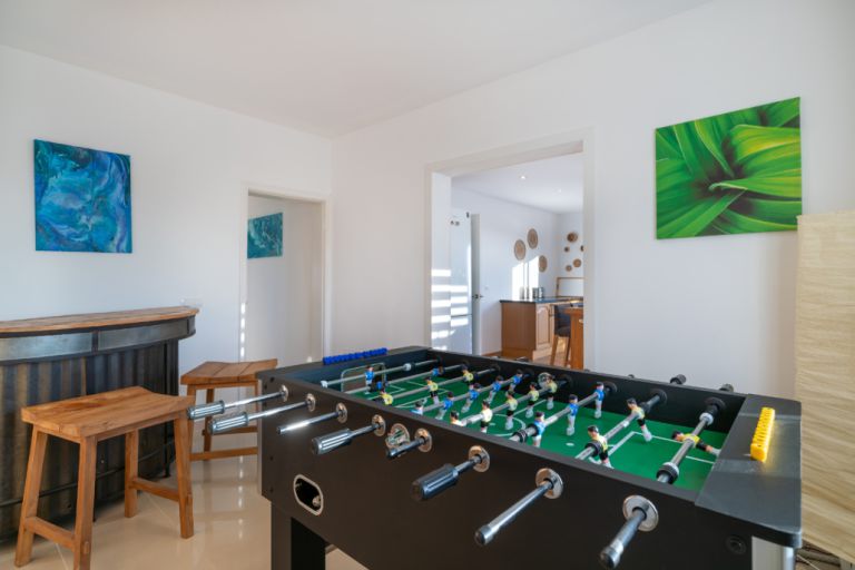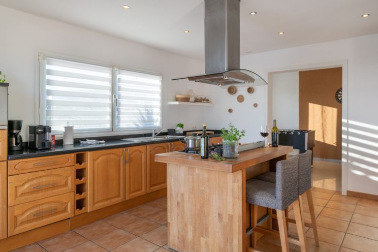 | So gibt es neben der Kochinsel, eine Kühlgefrierkombination, einen Backofen, Mikrowelle, Wasserkocher, eine Nespressomaschine, eine herkömmliche Filtermaschine oder einer Einbau-Espressomaschine. Die Küche verfügt über einen direkten Zugang auf die Terrasse Neben der Küche gibt es einen kleinen Barraum mit Theke, einer Dartscheibe und Tischfußball. |
