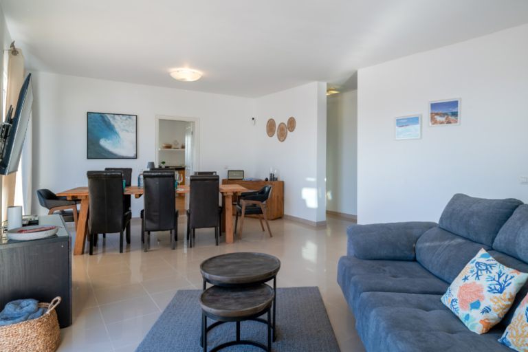 | Die zweietagige Villa ist mit 215 qm Wohnfläche, 4 Schlafzimmern und 4 Badezimmern für 8 Personen geeignet. Im Erdgeschoss liegen Wohnraum, Küche, Nebenraum mit Tischfußball und Dartscheibe, ein Badezimmer und das Appartement mit einem Schlafzimmer und ensuite Badezimmer. |
