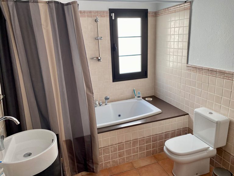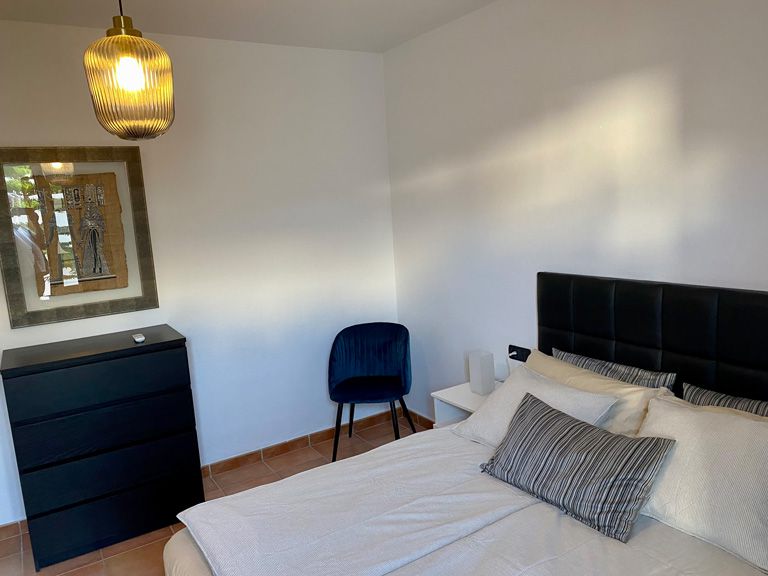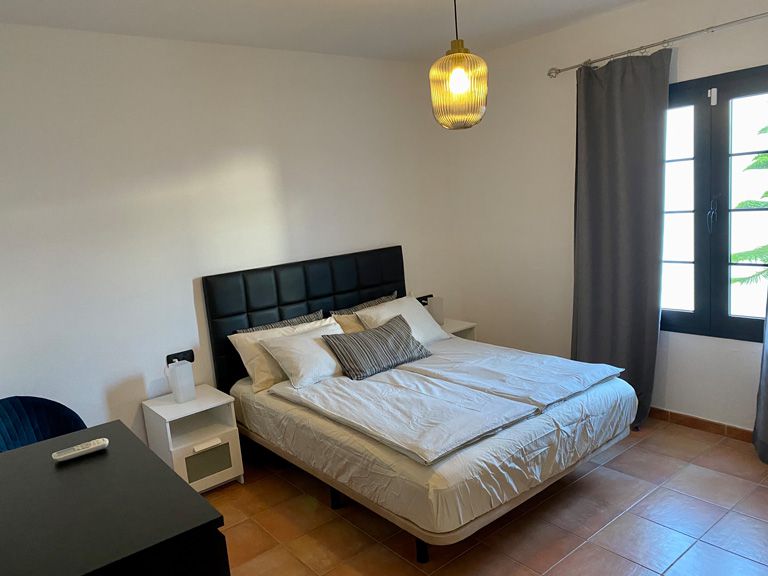 | Die drei Schlafzimmer sind mit Doppelbetten, Kleiderschrank und Klimaanlage ausgestattet. Das Masterschlafzimmer im oberen Stockwerk verfügt über einen großzügigen Ankleidebereich und ein en suite Badezimmer mit ebenerdiger Dusche. Die beiden anderen Schlafzimmer liegen im Erdgeschoss. Hier befindet sich auch das zweite Badezimmer, das mit einer Whirlpool Badewanne ausgestattet ist. Eines der beiden Schlafzimmer hat einen direkten Zugang zum Poolbereich. |
