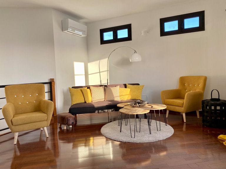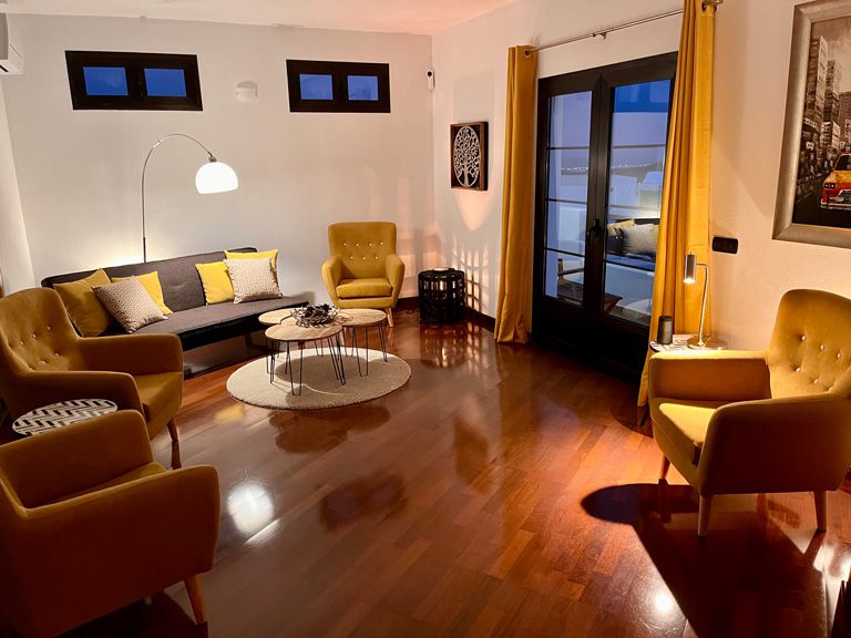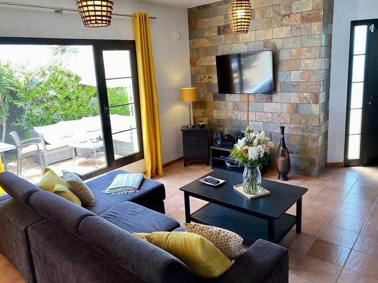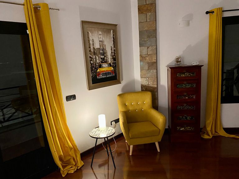 | Der im Erdgeschoss liegende Wohn- und Essbereich verfügt über eine Couch und mehrere gemütliche Sessel, ein SAT-TV mit Flachbildschirm mit deutschsprachigen und spanischen Programmen, Radio und CD-Player. Darüber hinaus gibt es einen Internetzugang über Wlan und einen Safe. |
