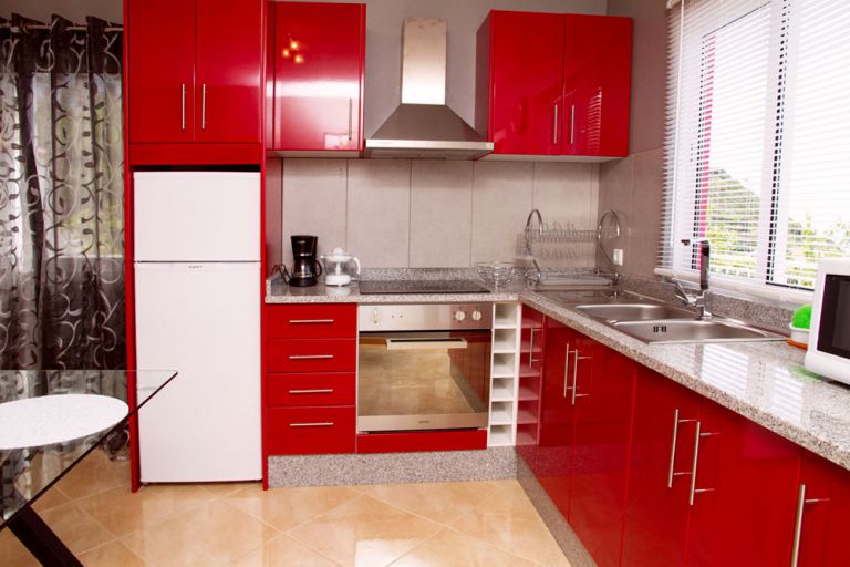 | Die moderne Einbauküche ist mit einem Cerankochfeld, Backofen, Mikrowelle, Kühlschrank, Kaffeemaschine, Toaster und einer Waschmaschine ausgestattet. | ||