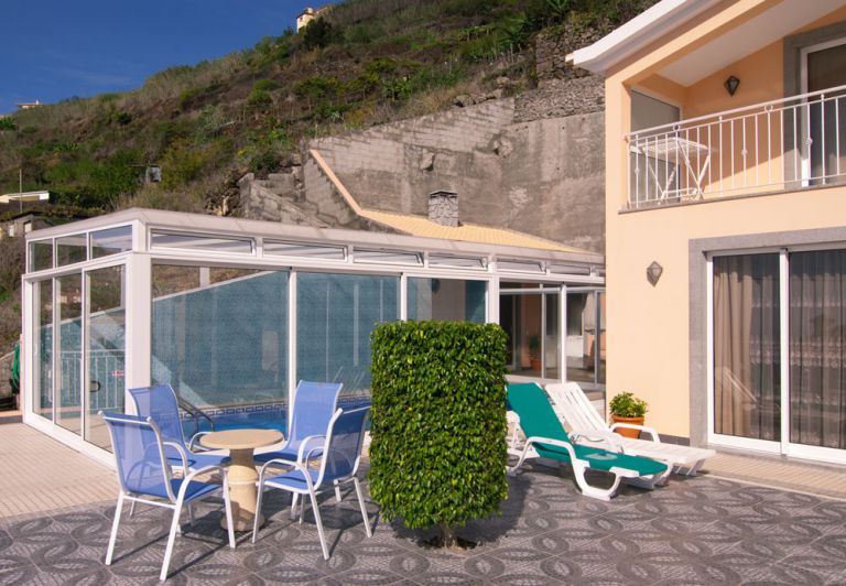 | Dieses komfortable Ferienhaus liegt an der Südwestküste Madeiras nahe der Ortschaft Calheta und bietet durch seine erhöhte Lage einen herrlichen Blick auf das Meer und die umliegende Natur. Highlight des Hauses ist der beheizte und überdachte Pool, der auch zur Nutzung in der Nebensaison einlädt. Der Pool ist komplett verglast, die großen Glasfenster lassen sich aber öffnen so das es wahlweise ein windgeschützter Innen- oder Aussenpool ist. Mit einer Wohnfläche von 120 qm bietet das Haus Platz für bis zu 6 Personen. | ||