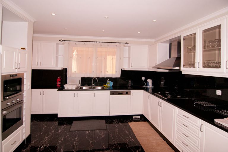 | Die exquisite Küche in modernster Optik verfügt über Geschirrspüler, Backofen, Herd, Wasserkocher, Mikrowelle, Toaster, und allen nötigen Kochutensilien. Ein Essbereich mit Tisch und Stühlen bietet Platz für 6 Personen. Desweiteren befindet sich hinter dem Pool ein überdachter, gemauerter Außengrill. Eine Waschmaschine ist vorhanden. | ||