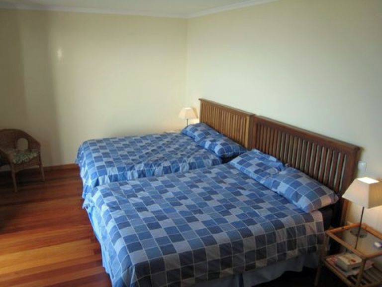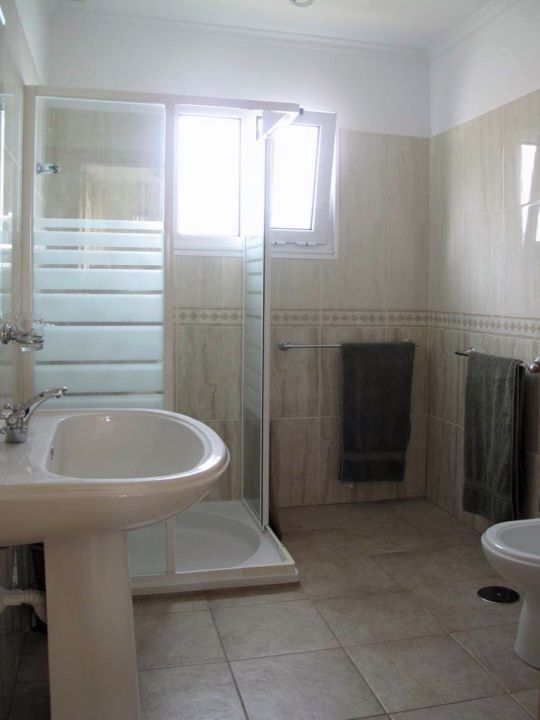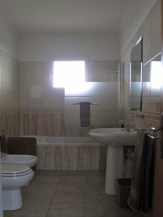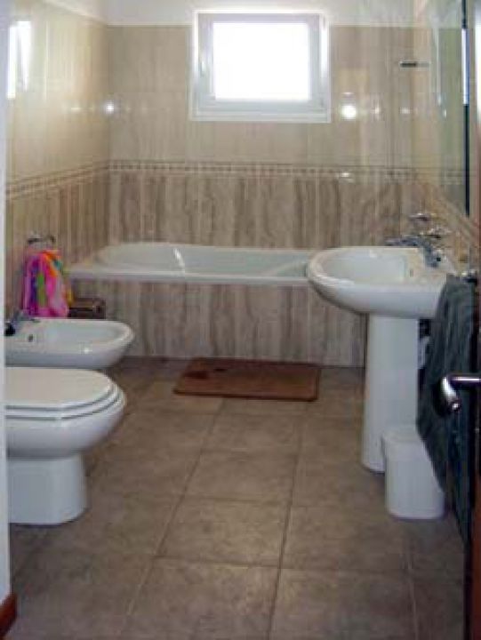 | In der ersten Etage der Villa befinden sich drei Schlafzimmer, eines mit zwei Queensizebetten, eines mit einem Einzelbett, das zu einem Doppelbett erweiterbar ist und eines mit zwei Einzelbetten. Ein Badezimmer ist mit einer Badewanne, die anderen beiden sind mit einer Dusche, Waschbecken, WC und Bidet ausgestattet. | ||