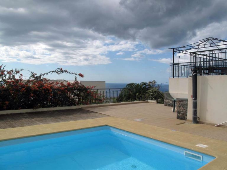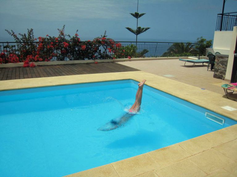 | In dem herrlichen Garten blüht alles üppig. Dank des milden Klimas auf Madeira tragen sogar die Bananen Stauden. Der Salzwasserpool ist von von Fliesen und Panelen umgeben. Eine Treppe ermöglicht einen leichten Einstieg ins Wasser. Hier befindet sich auch eine Dusche. |