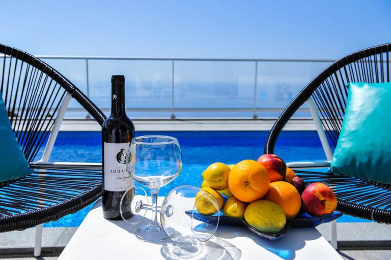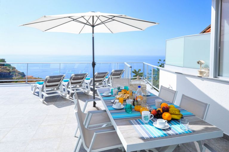 | Im unteren Bereich befindet sich der Außenpool mit Sonnenterrasse und Sonnenliegen und ein großer Esstisch mit Stühlen So können Sie auch Ihre Mahlzeiten mit Blick auf den Atlantik einnehmen. Ein angrenzender Außengrill ist vorhanden. | |||||