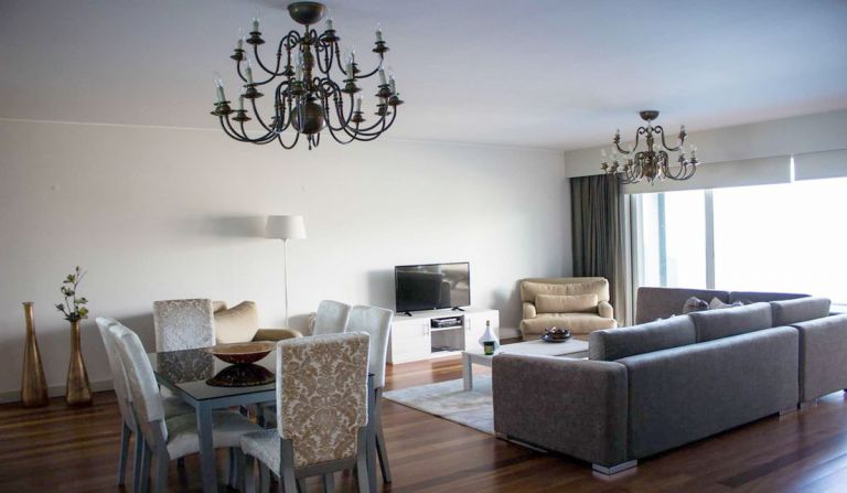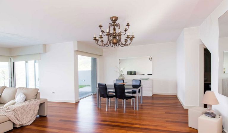 | Im Untergeschoss befindet sich der Wohnessbereich mit einem Esstisch und mit Flachbildschirm (Kabelfernsehen), Panoramaschiebetüren mit Ausgang zum Garten, dem Pool und der Sonnenterrasse. Ein Aussengrill ist vorhanden. Wlan ist in allen Bereichen verfügbar. | |||||
