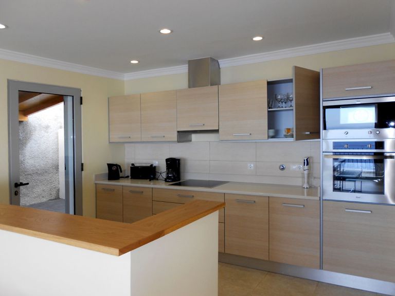 | Die durch einen Tresen abgetrennte Küche ist mit Cerankochfeld, Mikrowelle, Backofen, Kaffemaschine, Toaster und Wasserkocher ausgestattet. | ||