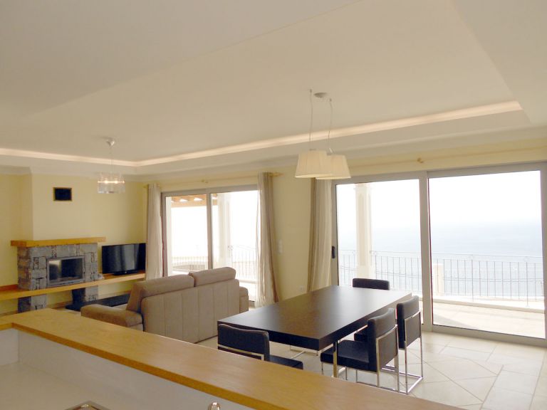| Der Wohnraum mit großer Göasfront zur Meerseite verfügt über eine Couchgarnitur, Kabel-TV und einen Esstisch für vier Personen. | ||
