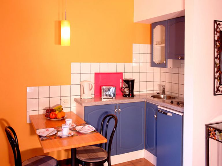 | Daran schließt die kleine integrierte Einbauküche an. Das Badezimmer ist mit Dusche, Waschbecken und ausgestattet. Vor dem Ferienhaus befindet sich die private Terrasse mit Sonnenliegen, Sitzmöbeln und einem schönen Meerblick. | |||||