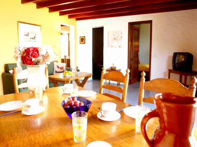 | Das Ferienhaus ist mit ca. 70 qm Wohnfläche für 5 Personen geeignet. Es besteht aus einem Wohnzimmer, das mit einer bequemen Couchgarnitur mit Schlafsofa (70 x 180) und SAT-TV ausgestattet ist. Der Essbereich ist in den Wohnraum integriert. Die Holzdeckenvertäfelung verleiht dem Raum eine gemütliche Note. | |||||