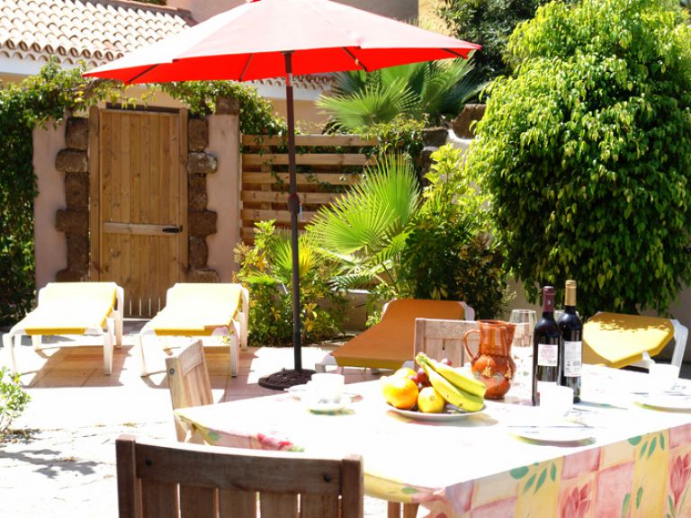 | Das Ferienhaus bietet eine großzügig angelegte Terrasse, auf der Sie völlig ungestört sind. Hier können Sie bei einer unvergeßlichen Aussicht auf das tiefblaue Meer herrlich entspannen und relaxen. Die Terrasse ist mit vier Sonnenliegen, Sonnenschirm und einem Grill ausgestattet. An dem runden Terrassentisch können Sie schon morgens Ihr Frühstück genießen. | |||||