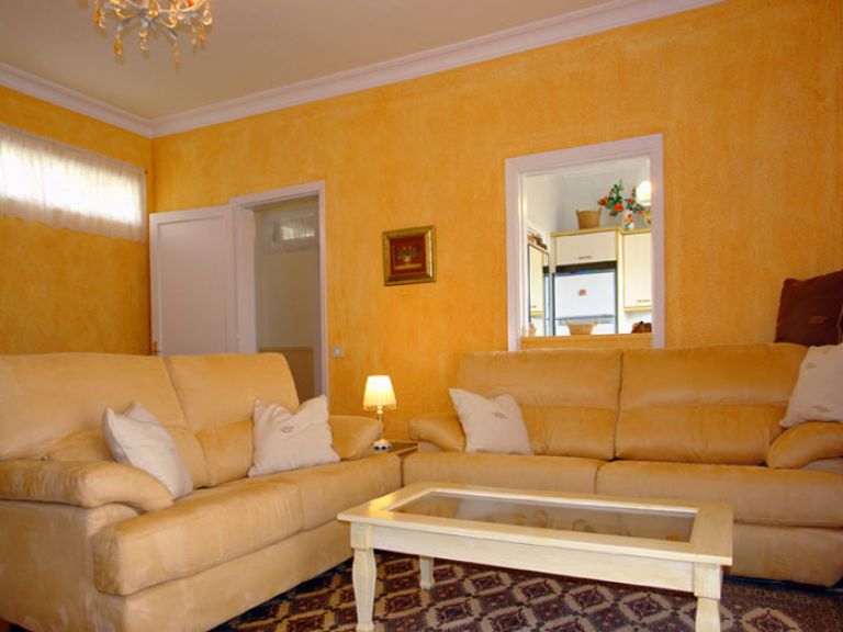 | Im Wohnzimmer stehen eine gemütliche Couchgarnitur und das SAT-TV für den Empfang fast aller deutscher Radio- und Fernsehprogramme in digitaler Qualität. Der im Wohnzimmer vorhandene Kamin dient nur der Dekoration. | ||