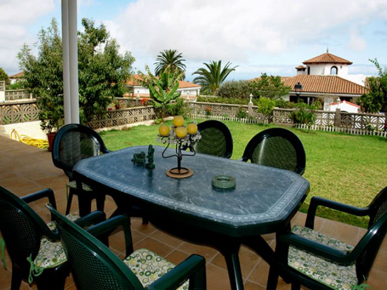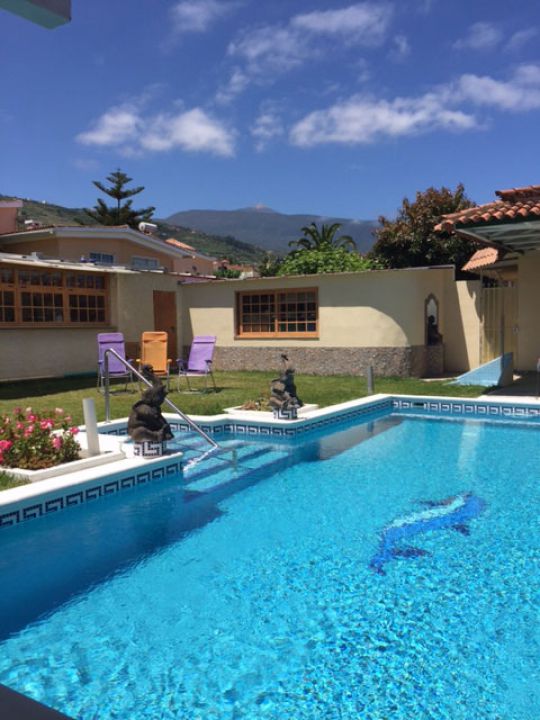 | Die Terrasse vor dem Ferienhaus verfügt über Gartenmöbel, Sonnenliegen, Sonnenschirm und einen Holzkohlegrill. Das Ferienhaus ist von einem großen Garten mit Rasenfläche und Sträuchern umgeben. Außerdem wachsen hier noch Obstbäume, wie Avocado-, Apfel-, Papaya- und Orangenbäume sowie Bananen, deren Früchte Sie gerne ernten können. Der herrliche Blick auf den Atlantik und auf den Teide, den höchsten Berg Spaniens, wird Sie begeistern. Der beheizte Salzwasserpool ist nur eine Minute vom Haus entfernt und wird von den Gästen zweier weiterer Ferienhäusern mitgenutzt. Er hat eine Größe von ca. 8 x 4,5 Metern bei einer Tiefe von 1,5 bis 1,7 Meter. |