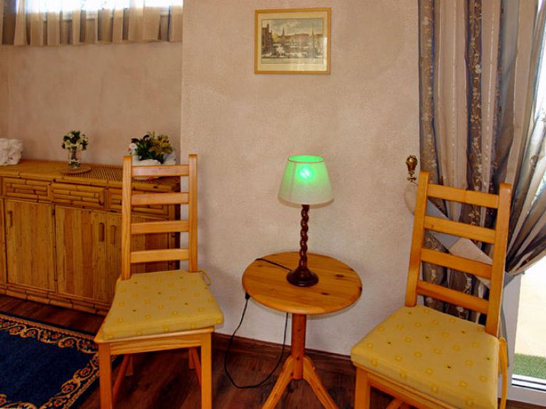 | Im Wohnzimmer steht eine gemütliche Rattan Couchgarnitur und ein SAT-TV mit Flachbildschirm für den Empfang fast aller deutscher Radio- und Fernsehprogramme in digitaler Qualität. Darüber hinaus gibt es einen Kamin für gemütliche Abende. | |||||