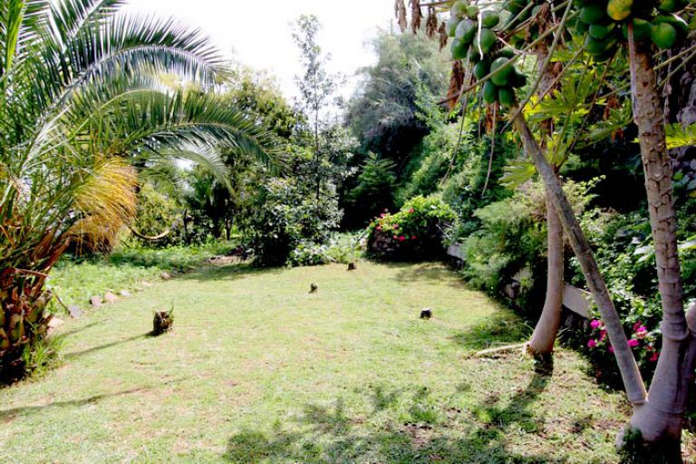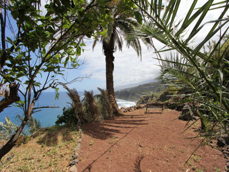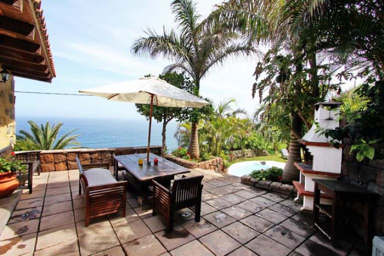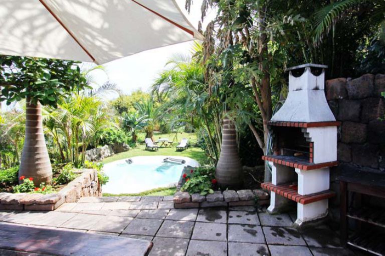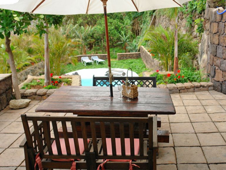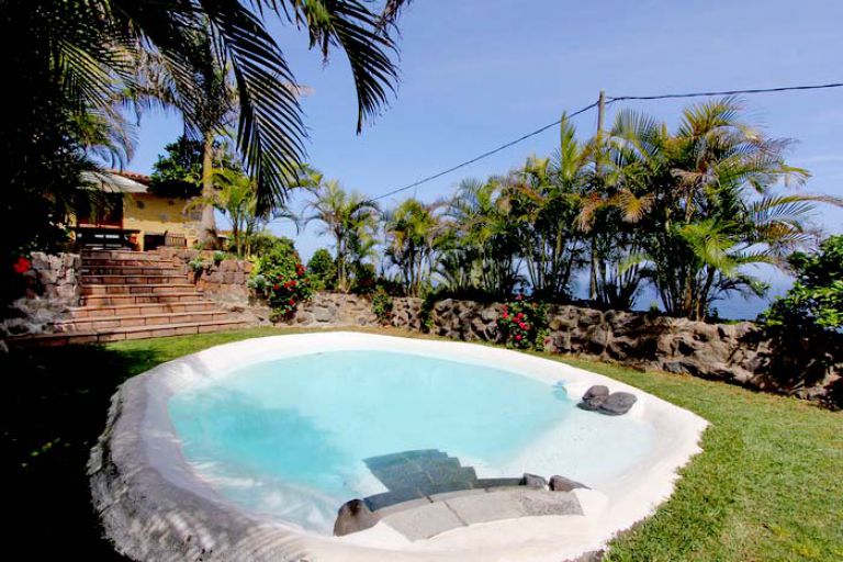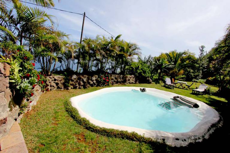 | Vor dem Ferienhaus befindet sich eine Terrasse und ein sehr gepflegt angelegter, kleiner Garten. Hier wachsen Bananen, Orangen, Papaya und andere Früchte. Der runde Pool hat einen Durchmesser von ca. 6 m und ist etwa 1,20 m tief. Zur Ausstattung der Außenanlage gehören Gartenmöbel, Sonnenliegen, Sonnenschirm und ein Holzkohlegrill. Von der Terrasse aus genießen Sie einen wunderschönen Blick auf den Atlantik und auf die Küste in Richtung von Puerto de la Cruz. Am Abend sehen Sie die Lichter der Nachbarinsel La Palma. | ||