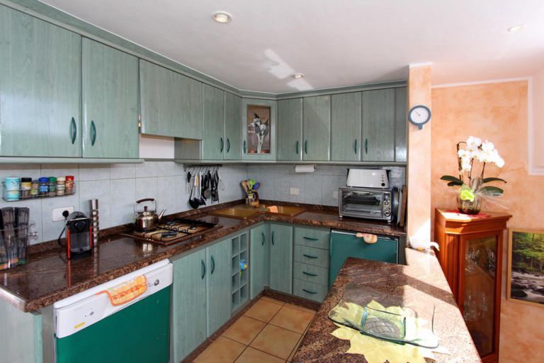 Die Küche ist zum Wohnzimmer hin offen, über vier Stufen zu erreichen und mit Waschmaschine, Toaster, Kaffeemaschine, Kühlgefrierkombination ausgestattet. | ||